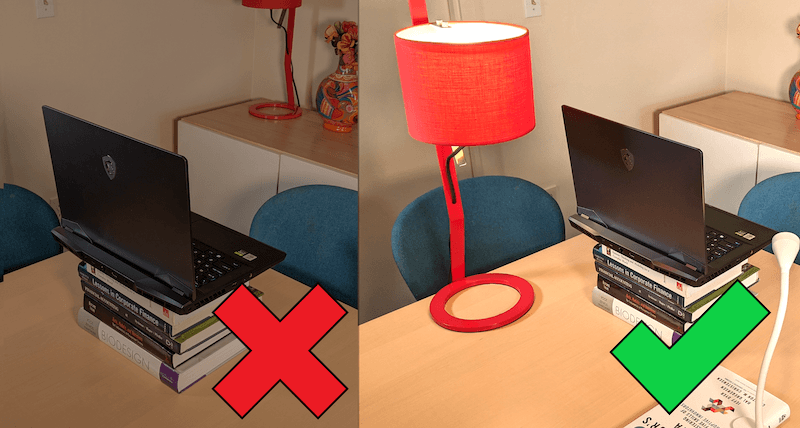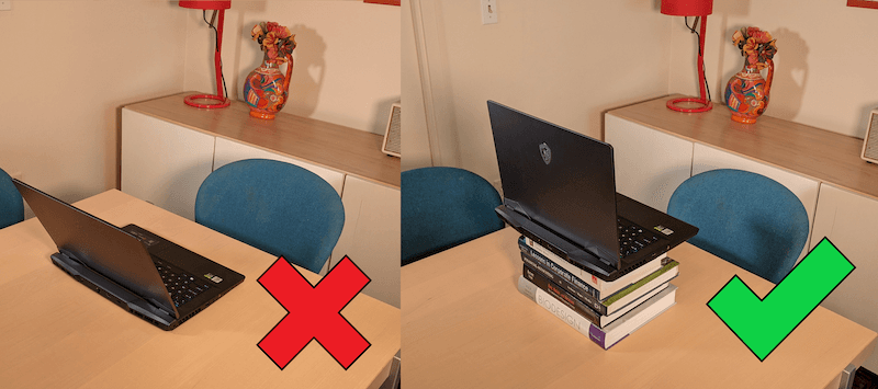 Your camera angle is also important. Nobody likes exploring the inside of a nose with no warning! Your camera should be just above your eye line and tilted down so that the top of your head almost reaches the top of the video. A quick hack is to stack some solid books together to raise the level of your laptop, but be careful - try not to shake everything by leaning on the table by accident.